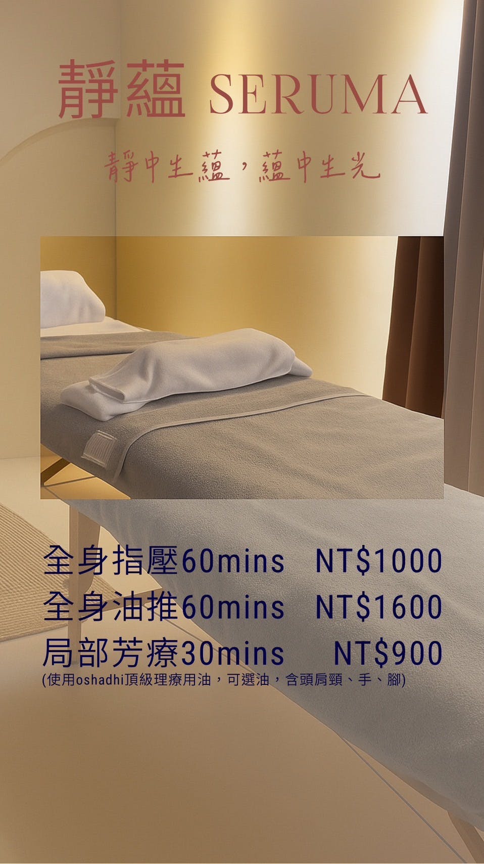 - 芳療師為女性,且需於房內體驗,體驗時僅著貼身衣物,油推服務需限女性體驗或情侶/夫妻同事在場時體驗。